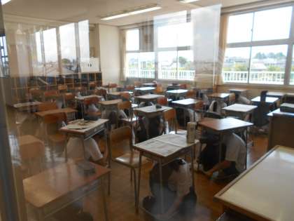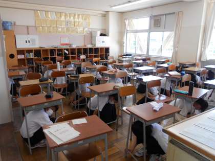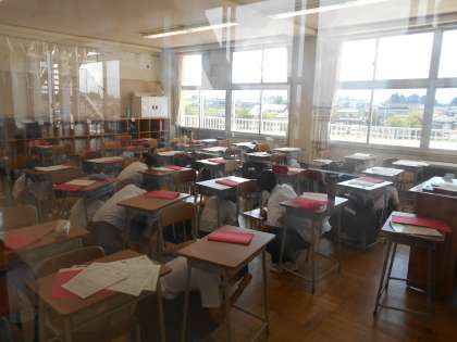 シェイクアウト訓練の様子〜2年生〜 公開日 2021/08/27 更新日 2021/08/27 2学年 2学年、シェイクアウト訓練の様子です。シェイクアウト訓練とは、「地震が来たときに、動揺せず、素早く身を守る行動をする」ための訓練です。 生徒たちは、地震の放送があると素早く身を守る行動をとることができました。