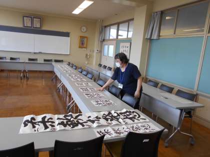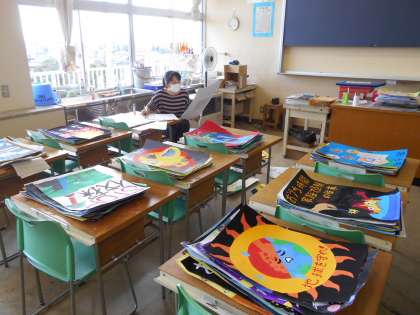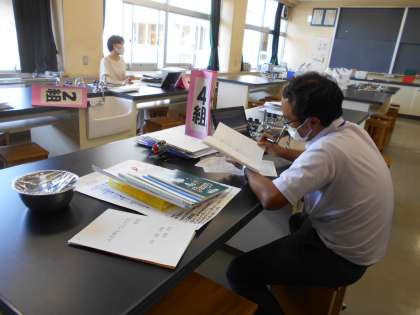 放課後の先生方は・・・その2 公開日 2021/08/27 更新日 2021/08/27 山室中学校のページ 8月27日(金) 写真上:理科室では自由研究の成果を確認中 写真中:会議室では、習字の作品をチェック中 写真下:美術室ではたくさんのポスターに囲まれて作品チェック中