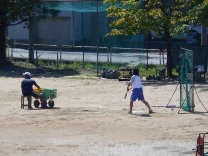 ソフトボール部は、スプリンクラーで水をまいてグラウンドを落ち着かせてから練習開始!顧問の先生が投げるボールを気持ちよく打っています。気持ちよさそう!