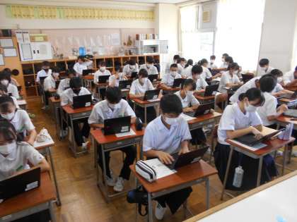 8月30日(月) 和やかな雰囲気の中で、授業が進んでいます。 (写真上:4組英語、下:5組社会)