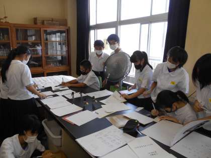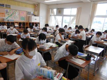 授業風景1年生 公開日 2021/08/31 更新日 2021/08/31 山室中学校のページ 8月31日(火) 落ち着いて授業に取り組んでいます。 写真上:英語ペアで「いくつ?」という表現を使う練習をしています。 写真中:県庁所在地を白地図で確認しています。 写真下:夏休みの自由研究を互いに見合って、感想を書いています。