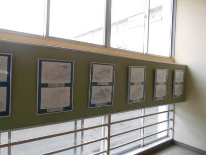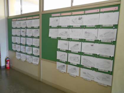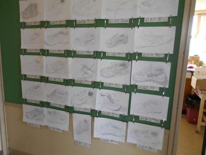 山室ギャラリー1年生 公開日 2021/09/01 更新日 2021/09/01 1学年 9月1日(水) 階段の踊り場、美術室前には、1年生の「見つめ、感じ取り、描く」より、自分の内履きズックを描いた作品が飾られました。なかなかの力作揃いです。ぜひ足をとめて眺めてみてください。