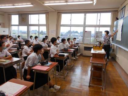 授業風景1年生 公開日 2021/09/01 更新日 2021/09/01 山室中学校のページ 9月1日(水) 1年3、4組の体育は、バレーボールの基本練習です。直上パス、床打ち等、ペアで行っています。(写真上・中) 1年6組の英語は、ものの数え方の表現の練習です。「一杯のコーヒーは?」(写真下)