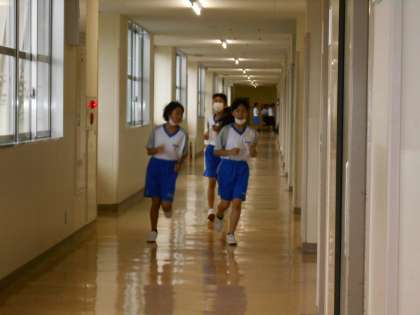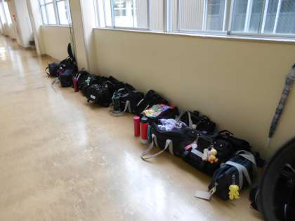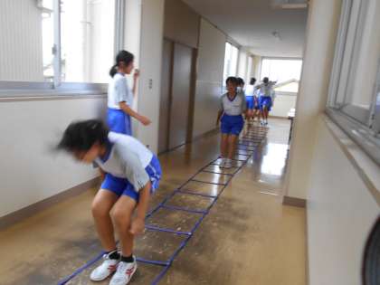 放課後の部活動その3 公開日 2021/09/01 更新日 2021/09/01 山室中学校のページ 9月1日(水) 廊下を使って、ラダートレーニングをするソフトテニス部、校内をランニングする女子バドミントン部です。鞄も邪魔にならないように、端にきれいに寄せて活動します。
