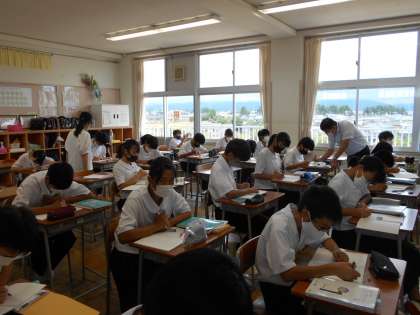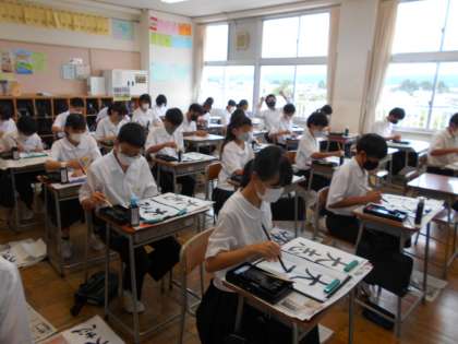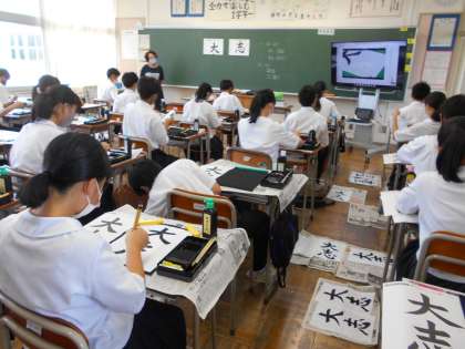 授業風景1年生 公開日 2021/09/02 更新日 2021/09/02 山室中学校のページ 9月2日(木) 1年1組は国語で書道に取り組んでいます。「大志」と落ち着いて書いています。モニターで筆運びを確認することもできます。(写真上、中) 1年3組は数学で文字式の計算をしています。川原先生に代わり、窪田先生がT2に入って教えてもらっています。(写真下)
