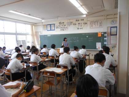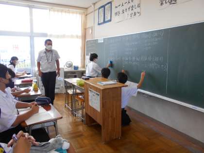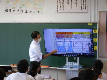 授業風景1年生 公開日 2021/09/06 更新日 2021/09/06 1学年 9月6日(月) 1年1組社会では、雨温図の見方を学習しています。モニターで拡大すると分かりやすいですね。 1年3組英語では、会話のために必要な基本文の練習をしています。 1年5組数学では、計算問題を黒板に記解き方の解き方の手順を確認しています。