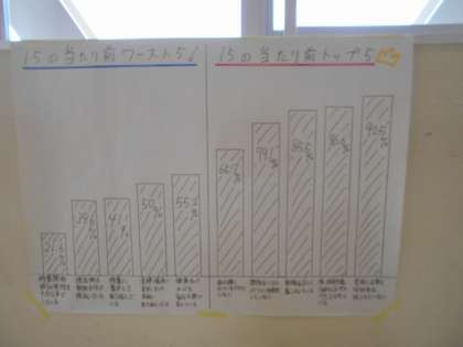 3年生学年協議会の活動 公開日 2021/09/08 更新日 2021/09/08 3学年 9月8日(水) 3年生学年協議会では、「学校生活の当たり前のこと15」をできている15、できていない15をアンケートでとり、棒グラフでまとめました。自分たちの様子を客観的に見つめることができていいですね!