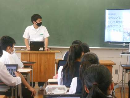 アニメ、治安、花札、着物、桜、和食、温泉等について、他の国と比較したデータを基にその魅力を伝え、どのようにして広めていけばよいか提案することができました。他の生徒も、相互評価しながら、熱心に聞いていました。