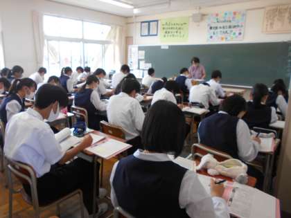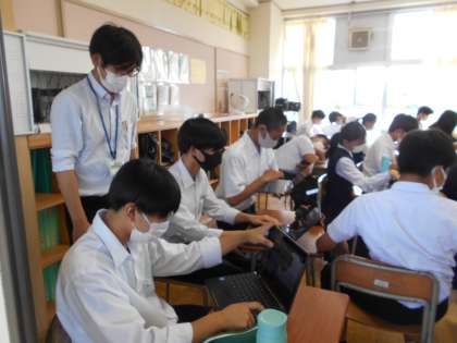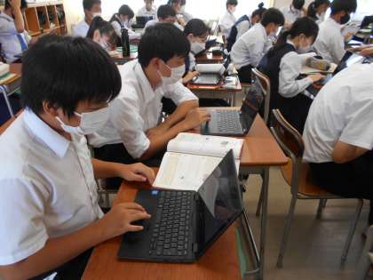 授業風景3年生 公開日 2021/09/14 更新日 2021/09/14 3学年 9月14日(火) 3年1組英語では、絶滅危惧種の動物について説明する英文をクロムブックで書いています。 3年3組理科では、DNAの研究レポートについてクロムブックを用いて調べています。 3年4組では、漢字テストを行い、厳しく自己採点をしています。