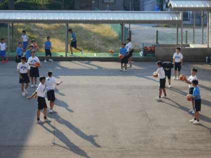 放課後の部活動その2 公開日 2021/09/16 更新日 2021/09/16 山室中学校のページ 9月16日(木) ハンドボール部は細かい足の動きを使いながらウォーミングアップです。 男子バスケットボール部は中庭を利用して、パスの練習です。