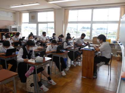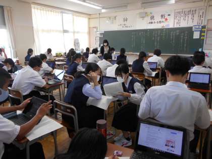授業風景2年生 公開日 2021/09/17 更新日 2021/09/17 山室中学校のページ 9月17日(金) 2−2国語:まずはワークのチェックから! 2−3英語:クロームブックを使いこなしています。 2−4国語:短歌を鑑賞するための情報収集をしています。