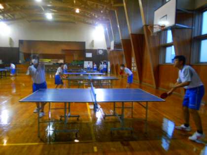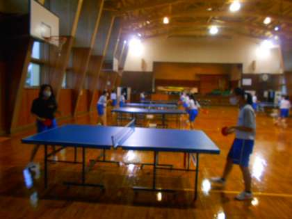 放課後の部活動その2 公開日 2021/09/22 更新日 2021/09/22 山室中学校のページ 9月22日(水) 外が雨のため薄暗く、体育館も電気を付けて活動しています。卓球部は、早々と準備を終えて打ち合い開始です。