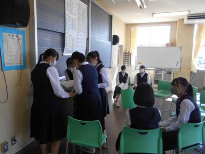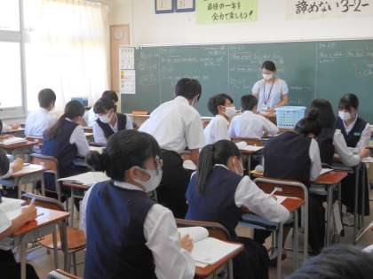 授業風景3年生 公開日 2021/09/30 更新日 2021/09/30 山室中学校のページ 9月30日(木) 3−2英語:授業のプリントにまずは自力で臨みます。英訳、英語の質問に答える等、熱心に取り組んでいます。 3−4音楽:合唱コンクールの自由曲の音取りをしています。女性パートは、どの場面をどのように歌うか相談中です。