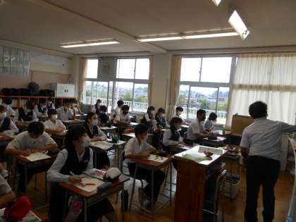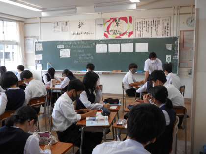 授業風景2年生 公開日 2021/10/01 更新日 2021/10/01 山室中学校のページ 10月1日(金) 2−1数学:多角形の内角の和の求め方を、各班で考えています。先生にも積極的に質問して聞いています。 2−3理科:教室の前には、思わぬゲストが!?びっくりです。人体模型を見ながら、内臓の作りやはたらきに興味津々の様子です。