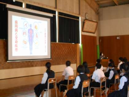 歯科衛生士による保健指導 公開日 2021/10/04 更新日 2021/10/04 1学年 10月4日(月) 1年生は5時間目に、歯科衛生士さんによる保健指導がありました。虫歯や歯槽膿漏が体の不調につながること等、具体的な写真や例を示しながら詳しくお話していただきました。これからも自らの歯と健康を守るために、しっかりと歯磨きをしていきましょう!