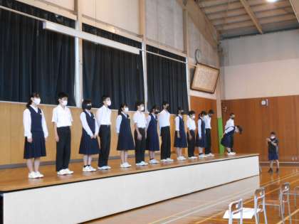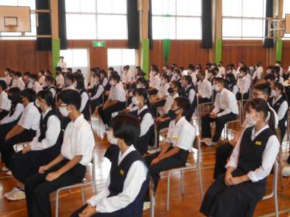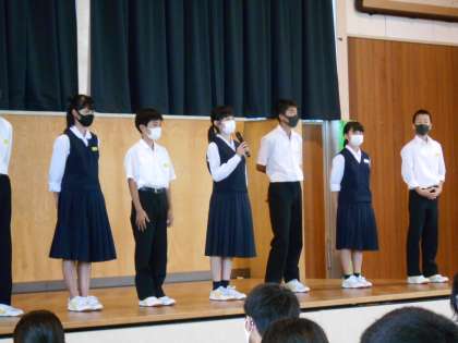 1年生学年協議会引き継ぎ集会 公開日 2021/10/06 更新日 2021/10/06 1学年 10月6日(水) 1年生は、前期から後期の学年協議会の引き継ぎ集会が行われました。前期とはがらりとメンバーが入れ替わり、フレッシュな顔ぶれです。後期メンバーの挨拶があり、温かい拍手で新リーダーを迎え入れる学年の雰囲気が伝わってきます。