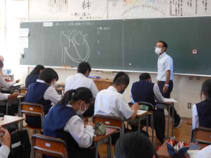 授業風景2年生 公開日 2021/10/07 更新日 2021/10/07 2学年 10月7日(木) 廊下のの配膳台の上に内蔵のつくりが分かるエプロンと、肺のつくりが分かる模型が!?びっくりです。 2−5理科:今日は心臓のつくりについて学習です。静脈、動脈等、色分けしたり血液の動きを書き込んだり、ノート作りも頑張っています。