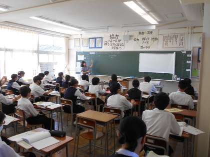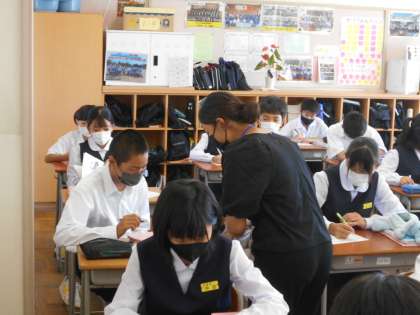 授業風景1年生 公開日 2021/10/07 更新日 2021/10/07 1学年 10月7日(木) 1−1、2組体育:ビデオを見た後、イメージをもってランニングシュートの練習です。 1−3英語:過去形で表現する練習中です。繰り返し発音することで慣れてきた様子です。 1−4英語:新しく着任されたALTの先生に教えてもらいます。