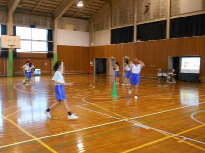 1−1、2体育:チェストパスからレイアップシュートの練習です。どこにパスを出すと、シュートしやすいかな?