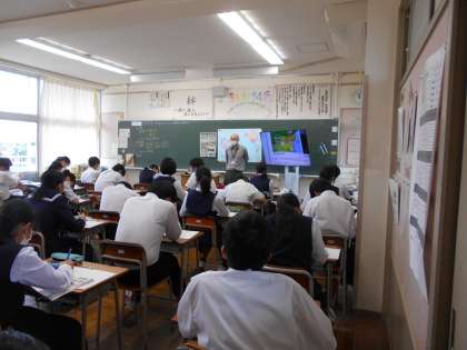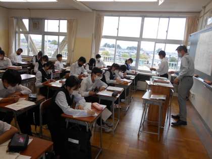 授業風景2年生 公開日 2021/10/13 更新日 2021/10/13 山室中学校のページ 10月13日(水) 2−2国語:定期テスト前とあって、みんな集中しています。 2−5社会:地形と気候の関係について、資料を見ながら考えています。 2−6理科:アニメを見ながら細胞の働きについて、理解を深めています。