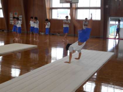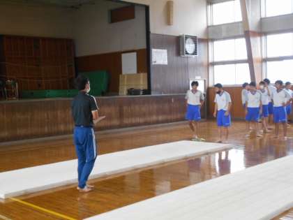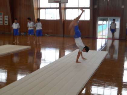 3年マット運動 公開日 2021/10/13 更新日 2021/10/13 山室中学校のページ 10月13日(水) 「倒立前転行きまーす!」「側転行きまーす!」と、次々に華麗な技を見せてくれました。元気いっぱい、全員がしっかりマット運動に取り組む姿が素晴らしいですね。