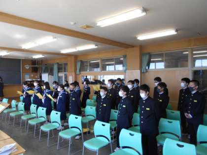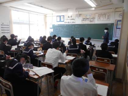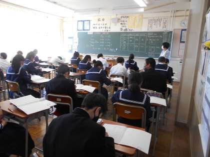 授業風景1年生 公開日 2021/10/19 更新日 2021/10/19 1学年 10月19日(火) 1−2理科:定期テストが返ってきました。問題の解説をしっかり聞いて直しています。 1−4英語:3人称の疑問文について学習中です。表を書いて覚えよう! 1−6音楽:パート練習の最後は、全体で合わせます。曲をこれから創り上げていきます。