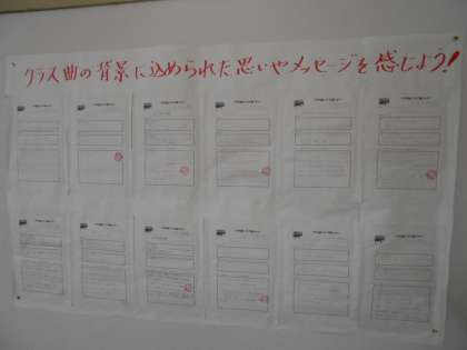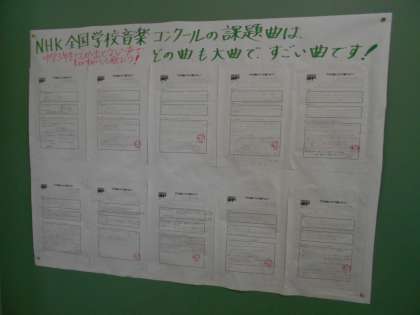音楽室の掲示板には、各クラスで歌う曲について調べたレポートが掲示されています。曲に込められた意味を感じながら歌うと、なお素敵な仕上がりになりそうですね。