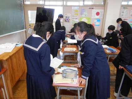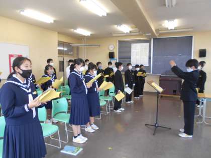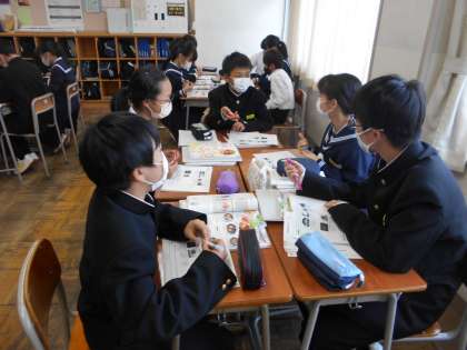 授業風景1年生 公開日 2021/10/20 更新日 2021/10/20 山室中学校のページ 10月20日(水) 1−1家庭科:次回の実習は「五感が喜ぶ煮込みハンバーグ」です。調理方法の工夫の理由を各班で考えています。 1−2英語:英語のワークシートを友達と教え合いながら完成させています。あちらこちらで教え合いが始まります。 1−5音楽:パート練習の後は、いよいよみんなで合わせます。リーダーがよかった点や改善点を伝えて、「もう一回歌いましょう!」