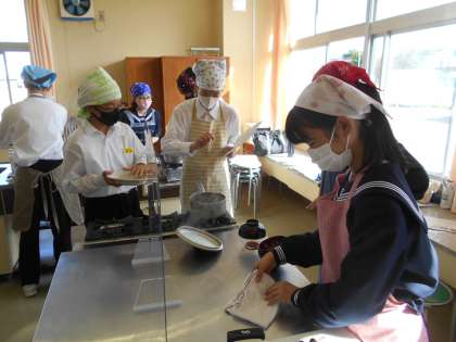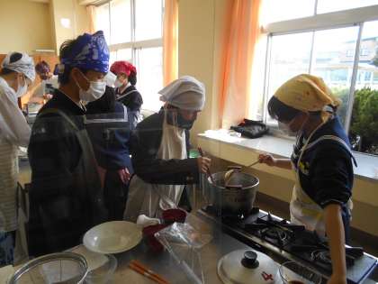 五感が喜ぶけんちん汁 1年5組編 公開日 2021/10/21 更新日 2021/10/21 山室中学校のページ 10月21日(木) 待ちに待った調理実習です。メニューはけんちん汁です。かつおぶしとこんぶから混合出汁をとりました。「おいしい!里芋がほくほくだ。」「だしのいい香りがするね。」