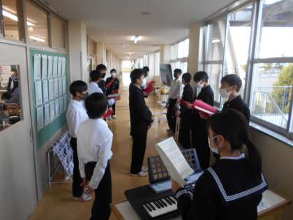 2年生 合唱練習 公開日 2021/10/21 更新日 2021/10/21 山室中学校のページ 10月21日(木) まずはパート練習で、音取りに専念しています。担任の先生も加わって、一緒に練習しているクラスもあります。