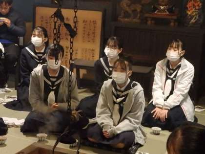 五箇山散策はあいにくの雨でしたが、貴重な合掌造りの中で、いろりで温めたお茶をいただきながらお話を聞きました。