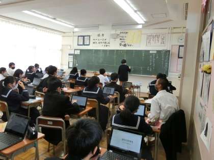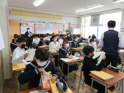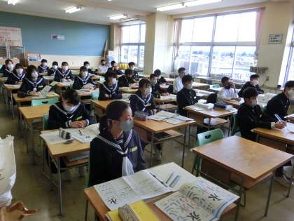 授業風景1年生 公開日 2021/10/26 更新日 2021/10/26 山室中学校のページ 10月26日(火) 1−3社会:教育実習の先生も共に学びます。どんどん質問しましょう! 1−4国語:歴史的仮名づかいを現代仮名づかいに直してみましょう! 1−6美術:レタリングの基本について学んでいます。