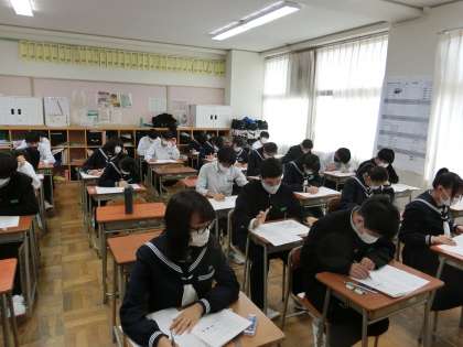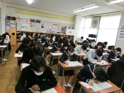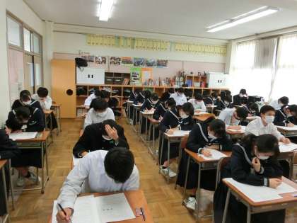 3年生 実力テスト 公開日 2021/10/26 更新日 2021/10/26 3学年 10月26日(火) 今日は1〜5限まで実力テストです。黙々とテストに向かっています。 (写真上:1組、中:2組、下:3組)