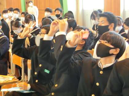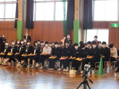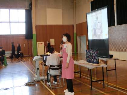 3年 いのちの授業 公開日 2021/10/27 更新日 2021/10/27 山室中学校のページ 10月27日(水) 家庭科の授業は、3年生全員で「いのちの授業」を実施しました。たんぽぽ助産院の野沢先生をお迎えして、講義や胎児人形だっこ体験、クイズコーナー、紙芝居等をしていただきました。 自分たちのいのちの誕生は、折り紙に空いた小さな針穴の大きさぐらいであることを、折り紙を透かしてみながら確認しています。