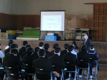 3年生 高校等説明会 公開日 2021/10/29 更新日 2021/10/29 山室中学校のページ 10月29日(金) 3年生は高校等説明会を行いました。私立高等学校、県立高等学校、富山高等専門学校の先生方をお招きし、学校について紹介していただきました。生徒は興味深い様子で聞いていました。この機会にご家庭でも、進路について話し合う機会をもっていただけると有り難いです。