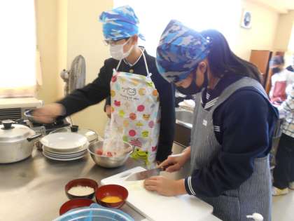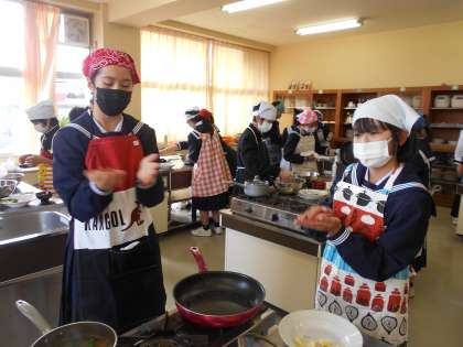 今日の1年3組は気合いが入っています。「前回より実習をスムーズに進めるぞ!」と言いながら、調理と同時に片付けも協力して頑張っています。盛り付けのソースのかけかたにもこだわって、視覚を喜ばせます。