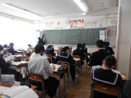 授業風景2年生 公開日 2021/11/17 更新日 2021/11/17 山室中学校のページ 11月17日(水) 2−1国語:漢文の読解にチャレンジ中です。どんな内容が書いてありましたか? 2−5理科:温帯低気圧の仕組みについて学んでいます。ノートにしっかり図を描いて考えています。 2−6家庭科:コンビニバックを製作中です。分からないところは友達と教え合ったり、自ら教科書を見たりしながら進めています。