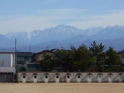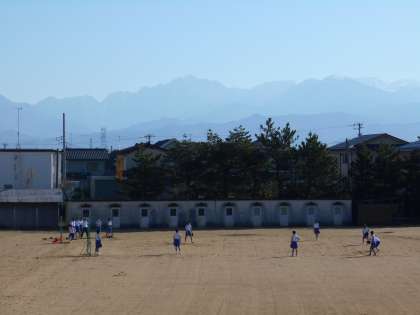 山室中学校のグラウンドからは、天気のよい日には立山連峰が本当にきれいに見えます。立山連峰がグラウンドで活動する生徒たちを温かく見守ってくれているような気がします。この恵まれた環境で、立山連峰に負けないくらい大きな人間に育ってほしいと思います。