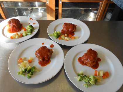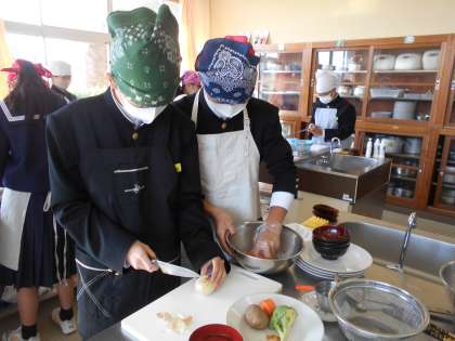 調理実習1年2組編〜五感が喜ぶ煮込みハンバーグ〜 公開日 2021/11/19 更新日 2021/11/19 山室中学校のページ 11月19日(金) 1年2組のみんなは、朝から実習やる気満々です。静かに話を聞き、チームワークよく、作業を進めています。盛りつけでは、ソースを慎重にかけるなど、視覚を喜ばせる工夫も見られました。片付けもばっちり!とても素晴らしい実習でした。