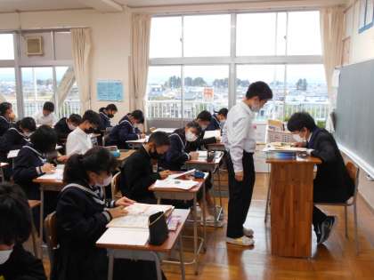 1年生 授業風景 公開日 2021/11/22 更新日 2021/11/22 山室中学校のページ 11月22日(月) 1−3、4体育:ソフトボールでTバッティングしたボールを、守備陣がキャッチ!フットワークもずいぶんと慣れてきましたね。 1−5理科:テスト前に分からないところを質問しています。 1−6音楽:「魔王」の鑑賞中です。どんなところに表現の工夫があるのか、真剣に聞いています。