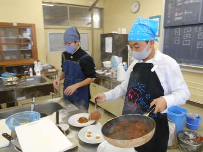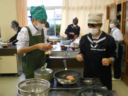 1年生、煮込みハンバーグ調理実習のラストを飾るのは1年4組です。調理室に来るのも速ければ、片付けもとても上手に、スピーディーにこなしました。