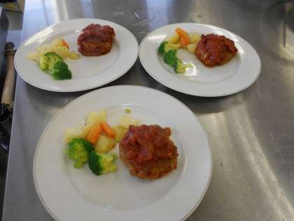 付け合わせ野菜も上手にバターでソテーして美しく盛りつけます。給食後にもかかわらず、しっかり完食しました。
