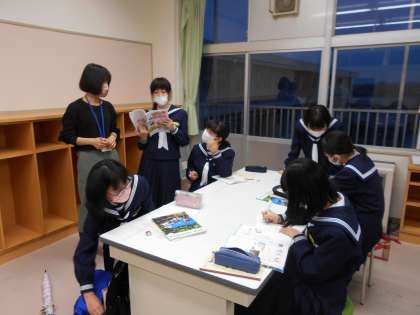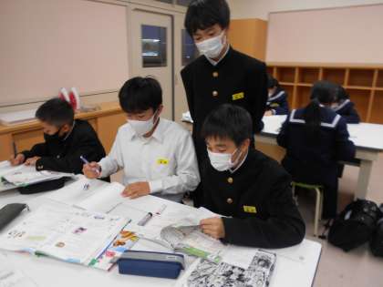 英語1学年協議会 勉強会4日目 公開日 2021/11/22 更新日 2021/11/22 山室中学校のページ 11月22日(月) 定期テストまであとわずか!今日も1年生の勉強会は大盛況です。英語の先生方も応援に駆けつけています。友達同士の教え合いは、教わる方も教える方にとっても学習効果が上がりますね。
