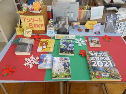 図書室からクリスマス 公開日 2021/12/03 更新日 2021/12/03 山室中学校のページ 12月3日(金) 図書室のおすすめ本コーナーは、早くもクリスマス仕様になっています。ついつい本を手に取ってみたくなりますね。