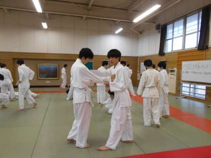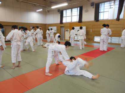 3年3、4組男子の体育は、柔道は「体落とし」という技にチャレンジです。武道場のあちこちで、「ドシン!」「バーン!」と勢いある音が響きます。受け身もしっかり身に付けていきましょう。