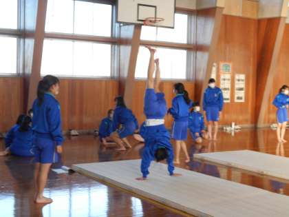 3年生 マット運動 公開日 2021/12/14 更新日 2021/12/14 山室中学校のページ 12月14日(火) 3−3、4組体育:女子はマット運動に取り組んでいます。倒立前転等、大技にどんどん挑戦しています。各自の目標の技をしっかりクリアできるように頑張っています。