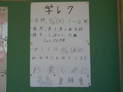 1年生 学年レクリエーション企画中 公開日 2021/12/14 更新日 2021/12/14 山室中学校のページ 12月14日(火) 1年生は、2学期の締めくくりに学年協議会で学年レクリエーションを企画中です。じゃんけん列車、しっぽとり、長縄等、各クラスの絆を強めつつ、学年みんなで楽しめる内容が盛りだくさんです。思い切り楽しみたいですね!