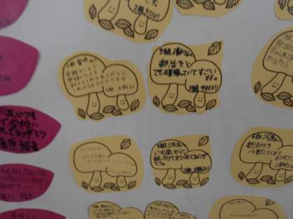 1学期から育ててきた、1年生の成長の木。2学期もすくすく育ち、花が咲いて実がなりました。さつまいもにきのこ、どんぐり等々、色々あります。