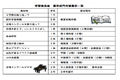 懇談会時の生徒作品展示について 公開日 2021/12/21 更新日 2021/12/21 山室中学校のページ 懇談会時に各教室や廊下を利用して、生徒作品を展示しました。 以下のような作品展示を予定していますので、来校の際にはぜひご覧ください。