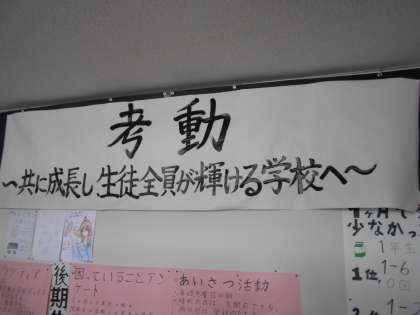 生徒会掲示板には、「考動〜共に成長し、生徒全員が輝ける学校へ〜」と力強く書かれた後期生徒会スローガンが貼られました。